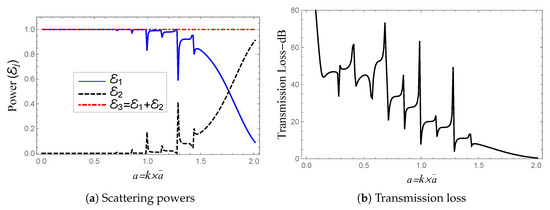 Chamber problem: Scattering powers and transmission loss against non-dimensional radius a with Hz, m, and m.