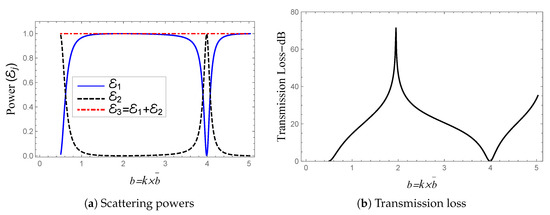 The impact of variation of the radius of the chamber, which, in fact, vary the size of structural discontinuity, is displayed in Figure 11. The scattering powers and transmission loss against non-dimensional radius b by varying its dimensional radius from a to 0.5 m, where m, m and m remain fixed, as shown in Figure 11. In Figure 11a, the reflected power is its lowest value when the structure does not involve any variation, i.e., when . But as the radius of the chamber varies, the reflection is shifted towards its peak value and vice versa for transmission. However, when the second mode of the membranes start propagating, a dip in reflection and, alternatively, spikes in transmission are evident. A dome-like behavior in the transmission-loss curve between the first two cut-ons of membranes is revealed, see Figure 11b.