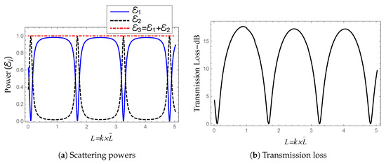 Figure 12 depicts the scattering power components and transmission loss versus non-dimensional half chamber length L, which is achieved through the variation of dimensional half length from m to m along with fixed values of m, m and m. A periodic variation in scattering power components as well as transmission loss against chamber length is seen. It is observed that, with the variation of the chamber length, a periodic variation in scattering powers and transmission is found. Moreover, the sum of reflected and transmitted power remains at unity in the whole regime.