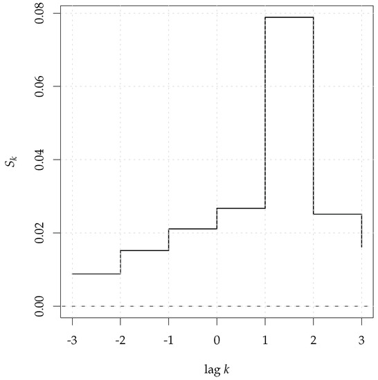 In the case where for all t, measures the serial dependence of at lag k, this can be interpreted as a nonlinear auto/cross-correlation function that overcomes the limits of Pearson’s correlation coefficient. As pointed out in [10,11,34], satisfies many desirable properties, including the seven Rényi axioms and the additional properties described in [34]. Moreover, it satisfies the so-called generalized data processing inequality of Information Theory that, inter alia, implies independence from the margins in the continuous case (see also [35], for a discussion).