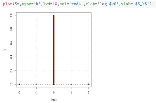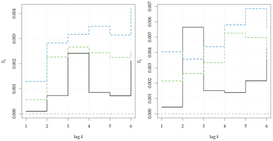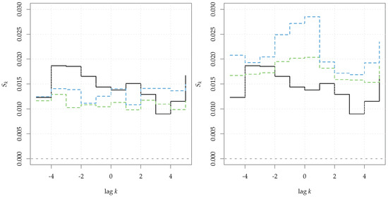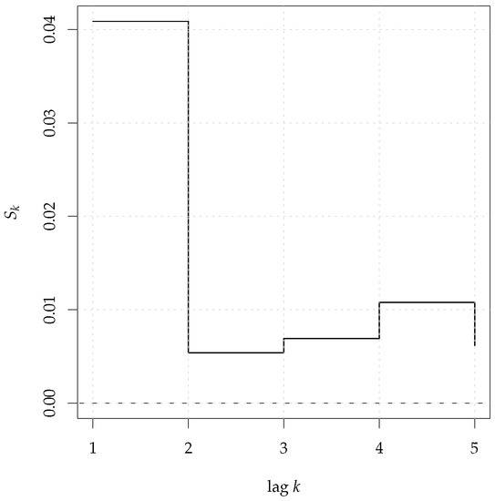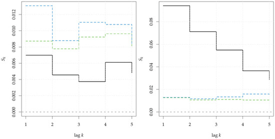 This is clear from the left panel of Figure 7 where the null distribution is obtained by randomly permuting the two series (ci.type = "perm"). This also destroys the serial correlation of the two series and biases the result of the test since the variance of the null distribution of the test statistic depends upon the autocorrelation of the series. One way to overcome this problem would be to prewhiten the series before applying the cross-entropy test (see e.g., ref. [42,43]). Such an approach has its limits, in that it is tailored to be used for testing with the cross-correlation function, but its use for general measures of dependence is questionable. The solution adopted in Srho.test.ts is to resample the series by means of a moving block bootstrap that preserves the serial dependence structure of the series [44]. This is selected by setting ci.type = "mbb", which is the default if y is not missing. The block length is equal to lag.max. The result of the right panel shows correctly that no lag of the cross-entropy exceeds the rejection bands at 99%.