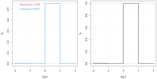 The results are shown in Figure 4. Note that, even if we are in the perfect dependence scenario, the maximum theoretical attainable level of is not 1 but results in (left panel, red dashed line) and this is confirmed by the estimate (blue line). By using the option nor = TRUE the normalized measure reaches 1 at lag zero (right panel).
