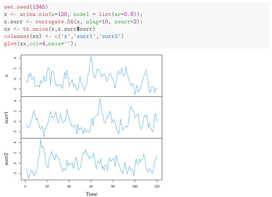 The function takes, as input, the original time series x, the number of lags of the autocorrelation to be matched by surrogates (nlag), and the number of surrogates nsurr. The remaining parameters pertain to the Simulated Annealing algorithm and are further discussed below in Section 4.1.1. We illustrate the use of the routine in the following example. First, we generate the original time series x from a AR(1) process. Then, we generate 2 surrogates and plot all the series, see Figure 9.