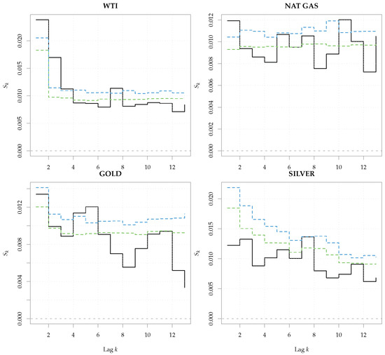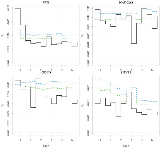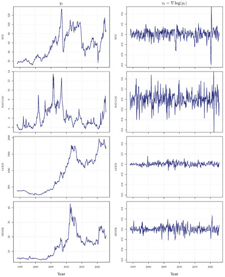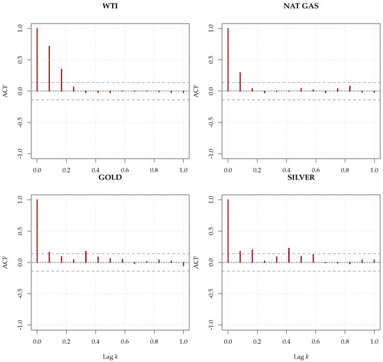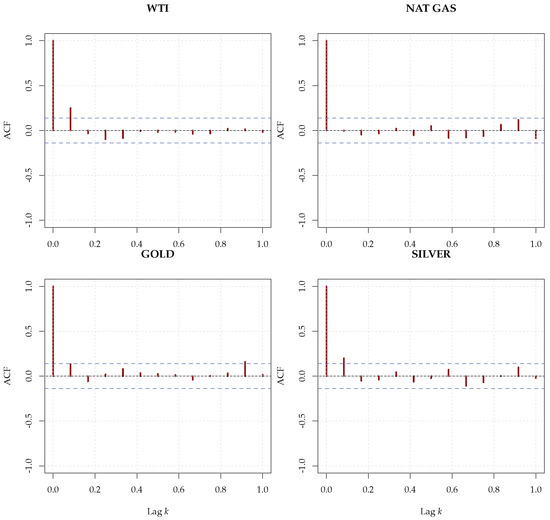 We considered 347 monthly observations, from January, 1994, to November, 2022, for the price of the four commodities. The two energy commodities were the WTI crude oil price index and the US natural gas spot price at the Henry Hub in Louisiana. The two precious commodities were gold and silver prices traded in London, with afternoon fixing. The series were obtained from the World Bank website https://www.worldbank.org/en/research/commodity-markets (accessed on 27 December 2022). For each commodity, we modeled log returns of their prices, that is , where denoted the price of commodity i () at time t. The time plot reported in Figure 16 highlighted that the series had different variabilities, which were lower for gold, while more pronounced for WTI oil and natural gas.