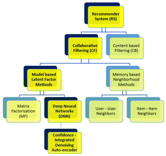 CF-based methods are further categorized into memory-based methods [28,31] and model-based CF [32,33] methods. Memory-based algorithms incorporate neighborhood information to approximate missing user preferences for certain products [34]. However, model-based CF methods follow a user’s rating scheme for the recommendations of products. Rating models in model-based CF are developed through different machine learning (ML) and data mining (DM) strategies such as deep neural networks (DNN) [35], Bayesian classifiers [36], genetic algorithms [37], and matrix factorization (MF) [38,39,40]. DNN strategies have provided a new dimension to research on RSs by devising a mechanism that provides latent features to standard CF-based methods [41,42]. The hierarchical structure for addressing the problem of RSs is summarized in the Figure 1.