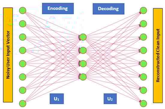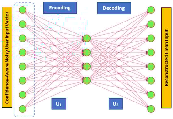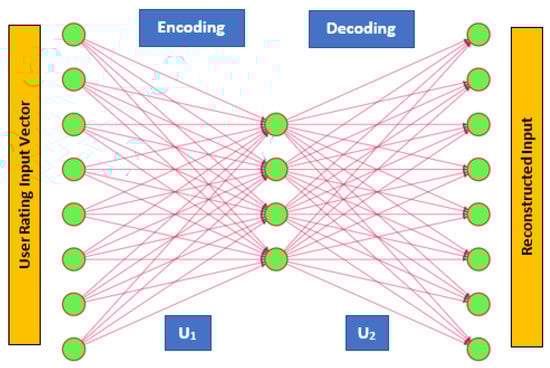 The architecture of an AE [52] for an RS is made up of encoding and decoding parts. The encoding part includes an input layer and the hidden layer, which is used to extract significant latent representations from a sparse input vector, of an input preference matrix, , to a space, with reduced dimensions. The decoding part consists of a hidden layer and the output layer. The role of the decoding part is to reconstruct the original input from the reduced latent representations, wherein , is the hidden layer’s bias and the matrix is the weight matrix of the input layer connected to the hidden layer. Likewise, signifies the output layer bias, and represents the weights associated with the output layer and the hidden layer. The multi-neural architecture of the standard AE is demonstrated in Figure 2.
