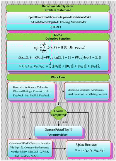 The overall flow of the proposed CIDAE for proposing top-N recommendations is graphically shown in Figure 5. However, the step-by-step pseudo-code of the proposed CIDAE is provided in Algorithm 1.
