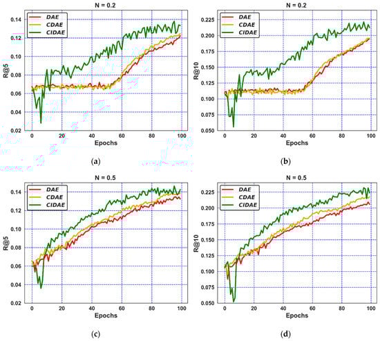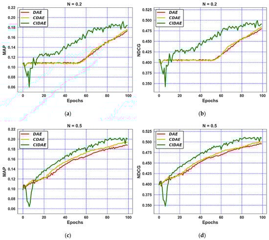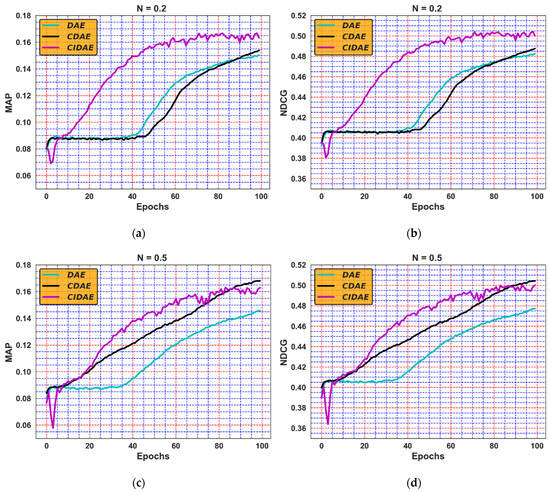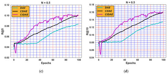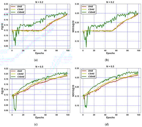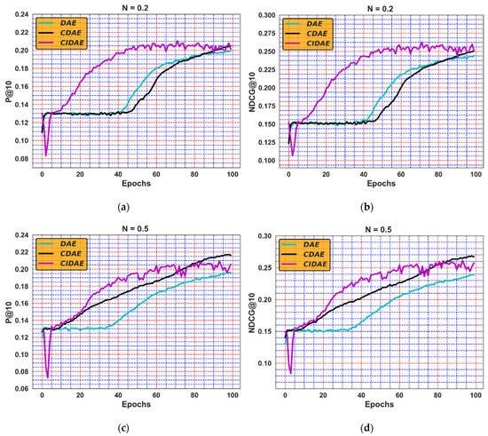 The relative performance of the proposed CIDAE over the DAE and CDAE is also validated for two more ranking-based evaluation metrics, i.e., P@10 and NDCG@10, for top-N recommendations. The comparative results for two noise variations are represented through learning curves in Figure 12. It can be observed from the plots given in Figure 12a,b that for = 0.2, the performance of the proposed CIDAE with respect to P@10 and NDCG@10 over the DAE was noticeably raised for 100 iterations, whereas the CIDAE achieved a great improvement in performance in terms of P@10 and NDCG@10 when compared to the CDAE for 90 epochs and achieved similar results for P@10 and NDCG@10 after 90 epochs. In addition, it can be observed from Figure 12c,d that the CIDAE increased from the 5th to 70th iterations.