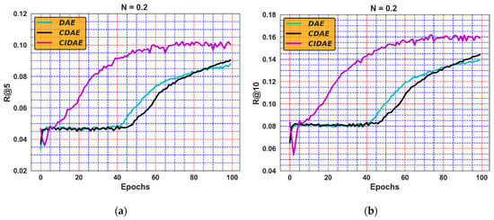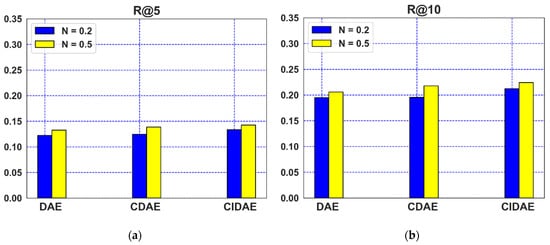The results in terms of the (R@5) score achieved by the CIDAE, CDAE and DAE after 100 epochs and with two noise values, i.e., [0.2, 0.5], are provided in Figure 13a. The CIDAE achieved a significantly improved R@5 score (0.1004) for = 0.2 over the CDAE (0.0904) and DAE (0.0880). The score attained by the CIDAE (0.0999) for = 0.5 was also substantial over DAE (0.0837), but the CIDAE slightly lagged behind the CDAE (0.1000). The bar graphs for (R@10) for the three methods with distinct noise values are presented in Figure 13b. The proposed CIDAE leads the CDAE and DAE in terms of the R@10 scores for both noise variations. The R@10 values attained by the CIDAE for = 0.2 and 0.5 are 0.1589 and 0.1608, respectively.
