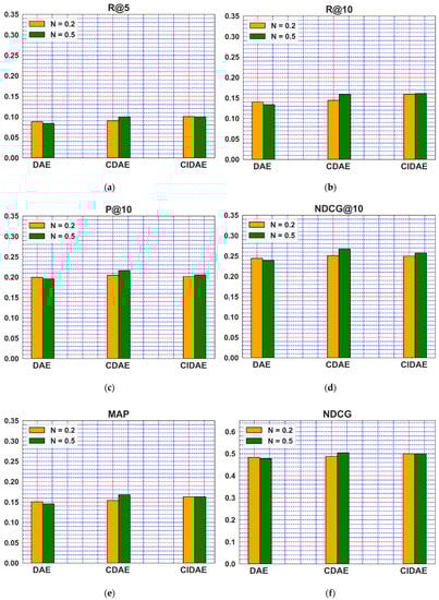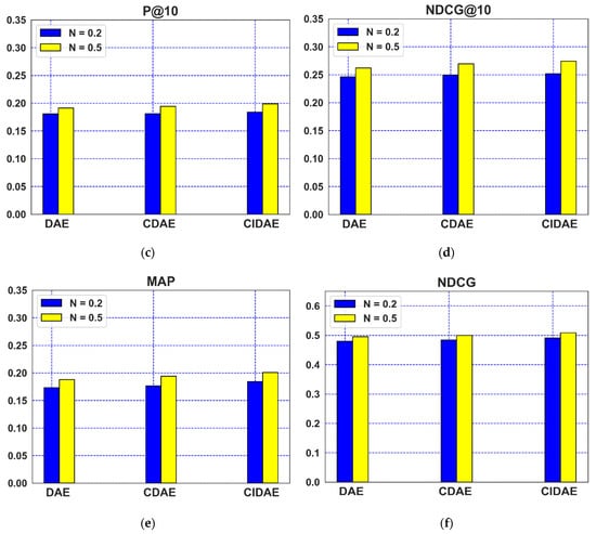 The bar graphs shown in Figure 13c exhibit (P@10) scores for the denoising auto-encoder variants with different noise levels, i.e., [0.2, 0.5]. It is noted from Figure 13c that the performance of the CIDAE was improved drastically over the DAE for = 0.2, whereas comparable results with respect to P@10 can be observed for both the CIDAE and CDAE, with = 0.5. Figure 13d demonstrates the NDCG@10 scores for the contending methods, given two noise variations. There was a slight increase in the NDCG@10 score gained by the CIDAE over the DAE, with = 0.2. However, the performance (NDCG@10) of the CIDAE when compared to the CDAE was decreased marginally for = 0.5.