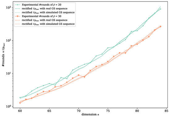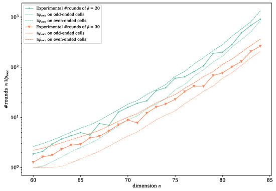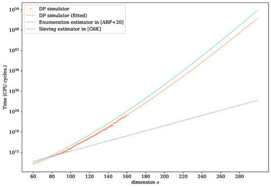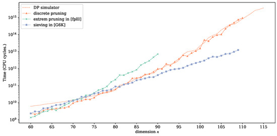 When comparing the performance of our implementation and extreme pruned enumeration, we show that DP enumeration, under optimal parameter settings, could outperform extreme pruning when . By comparing this with the state-of-the-art exponential-space SVP algorithm, sieving with dimension for free [36,37], we report an updated crossover point of enumeration and sieving at , which is slightly higher than previously observed. Then, at a higher dimension (), we compared the asymptotic behavior of DP enumeration, extreme pruned enumeration and sieving, which also shows the advantage of the discrete pruning method compared with other polynomial-space SVP solvers.