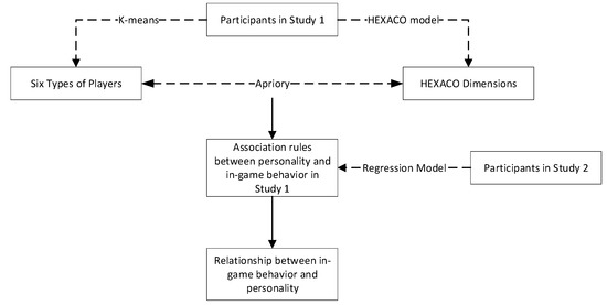 The main goal of this research is to find the association between in-game behavior and personality. This research is divided into two studies, in which we have gone into more detail. In Study 1, we collected players’ in-game behavior data in “Clash of Kings” (COK), which is an online warfare strategy video game developed by ELEX. We clustered players into different groups through K-means. Then, we distributed questionnaires to players to collect their HEXACO personality traits, after which we analyzed the correlation between personality and in-game behavior through apriori algorithm. Study 1 conducted a fundamental analysis to study the relationship between in-game behavior and personality in COK, which was in the form of a pre-analysis. Based on the association rules obtained in Study 1, Study 2 collected data from several other games, including mobile games, MOBA games, stand-alone action games, and other types of games, to verify the results in Study 1. Besides this, a self-reported method [4] was introduced, using questionnaires to understand the players’ self-evaluation of their game performance (mainly in terms of killings, deaths, and attacks). Overall, Study 1 provided a fundamental analysis, depicting the players’ types and the basic correlation between personality and in-game behavior. Afterward, Study 2 verified the results in study 1. The framework is shown in Figure 1.