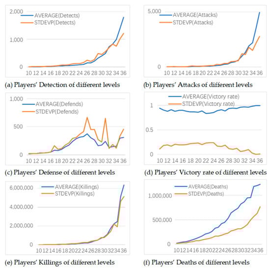 To better study players’ in-game behaviors, the in-game primary data should be selected to describe the players’ acts. Defense varied irregularly, while victory was basically unchanged. Furthermore, with the players upgrading, players’ value in terms of detection, defense, killings, and deaths change obviously and regularly, while their values in terms of detection and attacks were almost the same. The correlation coefficient between detection and attacks is over 0.989, which is in accordance with the reality that players would detect enemies before an attack was mounted. After a brief correlation analysis between the 13 items and players’ levels in COK, three items that were most strongly associated with players’ ability and level, including killings (armyKill), deaths (armyDead), and attacks (attacksLose plus attacksWin), were selected to study the in-game behavior. Overall, killings, deaths, and attacks (KDA) were taken as the players’ three principal in-game behaviors in COK, represented as , indicating the number of kills, deaths, and attacks experienced by the players in the game.