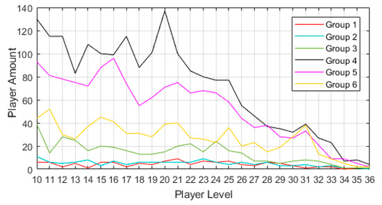 Visibly, in G3COK to G6COK, with the levels getting higher, players are becoming fewer, but in G1COK and G2COK, the number of players differs little among the different levels. Accordingly, we set up a hypothesis that player type influences the relationship between player level and player number. In MATLAB, the null hypothesis of the crosstab function is independent in each dimension. Thus, the distribution of the different groups is different. The distribution of players with low or middle attacks (G3COK–G6COK) is consistent (p-value = 0.0059) with the rule that low-level players are more common and high-level players are less common. While the distribution of players with high attacks (G1COK–G2COK) is independent of level (p-value = 0.9451), since the distribution of high-level players is the same as that of low-level players, this leads to an assumption that attack behaviors might be a pivotal and sensitive factor by which to classify players, as it has an impact on the relationship between player level and player amount.