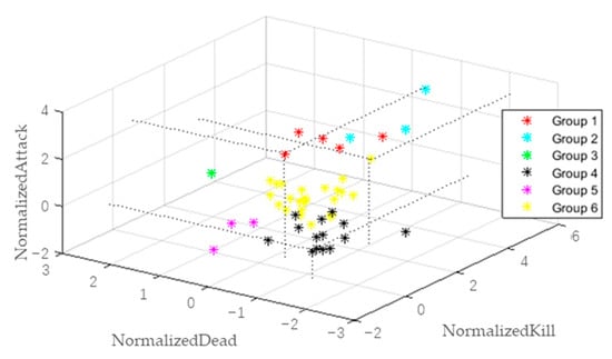 Since players in the first part could be divided into six groups, for the players who participated in the HEXACO-60 questionnaires, normalized values in the second part are used to divide the players into six groups, based on the centroids of K-means clusters from the first part of the data. The classification is displayed in Figure 5. To better illustrate the three-dimensional effect, three points are marked with dotted lines.