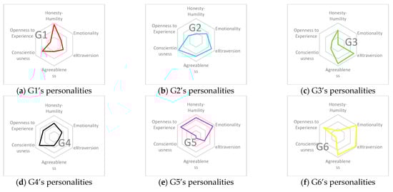 By observing how players from six different behavior groups scored for the six personality traits (HEXACO), we could better understand the finding that players of different groups have different personality traits. The HEXACO scores of every group, presented in the form of radar charts, can be seen in Figure 6, which clearly shows that players’ personality scores differ greatly among the different groups. For example, in Group 1, the openness to experience score is relatively low and the honesty/humility score is high, while in Group 6, both honesty/humility and conscientiousness are low. In contrast, openness to experience, emotionality, extraversion, and agreeableness are high.