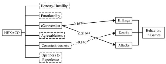 The results of the regression analysis, showing that the personality traits were partly related to in-game behaviors. The significant positive associations were indicated by solid black arrows, the significant negative association were indicated by a dashed black arrow. Honesty/humility, emotionality, agreeableness, and openness to experience, which had no correlation to any in-game behaviors, are indicated by a dotted box. Notes. ** p < 0.01, * p < 0.05.