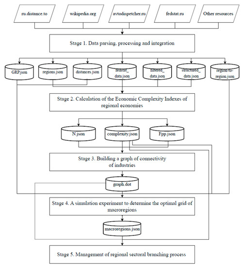 At the first stage, automated collection of statistical data (parsing) is carried out from open Internet sources such as: EMISS State statistics www.fedstat.ru (accessed on 7 February 2022), the search engine duckduckgo.com (accessed on 5 February 2022), the distance calculator ru.distance.to (accessed on 16 January 2022), the free encyclopedia wikipedia.org (accessed on 16 January 2022), calculation of distances “Autodispetcher” avtodispetcher.ru (accessed on 25 January 2022), etc. Additionally, at this stage, rough data processing occurs for the use in subsequent stages.
