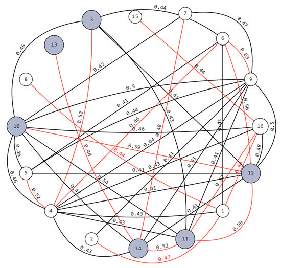 At the second step, an auxiliary square connectivity matrix is built, which displays the connections only between the industries obtained in the previous step, and the relationship between the industries is visualized. At the same time, in order to visualize the shortest (i.e., having the least number of edges) production chain with the strongest connections, the maximum spanning tree is found. Further, the results are presented in the form of an industry connectivity graph (Figure 3), in which the nodes are economic activities and the edges are the strength of the connection between activities. Top industries highlighted in gray are high-tech. The edges highlighted in red are included in the maximum spanning tree calculated by the Kruskal algorithm.