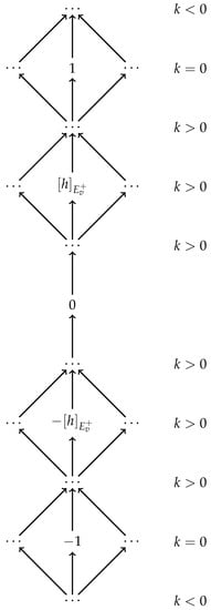 The nodes situated above the central node labelled by 0 correspond to elements of P. The nodes below correspond to elements of . Each level of this graph, which is above the central node labelled by 0, corresponds to an integer k. For instance, the level of the node labelled by 1 consists of all the nodes situated on the left and on the right of the node labelled by 1 and corresponds to the integer . The levels below this level correspond to positive integers and the levels above to negative integers . Similarly, each level below the central node labelled by 0 correspond to an integer. There are no edges between any two nodes of the same level, as they are incomparable. If two nodes are in different levels, then they are connected in the upwards direction.