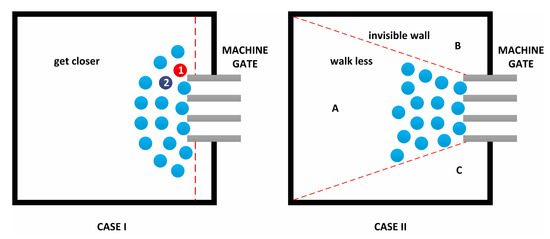 In case I, pedestrians thought they could get out faster if they could get closer to the gate machines. They will eventually form an arch in front of the gates. In case II, pedestrians choose to move along the most direct (shortest) path to the gate machine. Relatively speaking, this is a more orderly and polite way of walking. For example, in the first case, pedestrian 1 will cut in from the side to compete with pedestrian 2 for going out. In the latter case, we assume that pedestrians only move in area A, just like there is an invisible wall between area A and area B, and between area A and area C, respectively. Therefore, we added the force of the invisible wall f i W to the model to reflect this setting. The expression of this force is similar to that of the obstacle force in Equation (3). In practice, some places force pedestrians to walk in area A through measures such as setting up a fence.