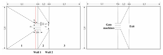 We consider the following simulation scenarios. Suppose that the pedestrians’ movement area is a rectangle with a length ( L 1 + L 2 + L 3 ) of 26 m and a width ( L 4 ) of 15 m, as shown in Figure 3. The whole area is divided into three parts: part 1 is the indoor area with length L 1 = 11 m, part 2 is the middle area between the gate machines and the exit, and part 3 is the outdoor area. Two situations will be considered, one is that the crowd walks from the indoor area to the outdoor area, and the other is the opposite. In both situations, the crowd has to go through the exit and the gates. The gate machines are in the middle of wall 1 and the length D 1 and width D 2 of a gate machine are 1.4 m and 0.1 m, respectively. The width of the passage between two gate machines D is 0.6 m. The number of passages varies from 3 to 8. The exit is in the middle of wall 2, and is 2 m wide. The dotted lines in Figure 3 are the invisible walls mentioned in Section 2.2.