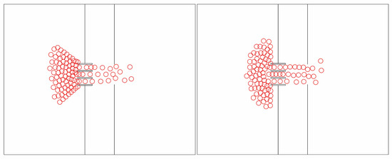 Figure 9. Snapshots of the evacuation process when the exit width is 3 m. (Left): The passage number is 5. (Right): The passage number is 8.