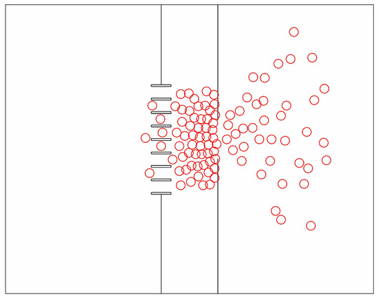 The gates are the bottleneck area during the evacuation of a crowd. When the number of passages is small, the crowd will form a fan or arch congestion in front of the gates, as shown in Figure 5, thereby reducing the evacuation efficiency. On the other hand, the existence of gates also helps to generate order, that is, pedestrians will line up after passing through the gates, so the evacuation time can be reduced when the number of passages is appropriate. When the number of passages is too large, such as eight, due to limited exit capacity, crowds will form chaos after a short queue and congestion at the exit as shown in Figure 6, and the evacuation time will increase slightly. As mentioned above, the invisible wall helps prevent pedestrians scramble for gates and therefore reduces evacuation time.