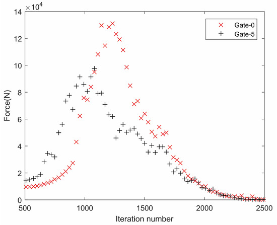 We also compared the forces on the pedestrians with and without the gates. The values in the y-axis are the sums of the pedestrian forces acting on each pedestrian at every iteration step. For the situation with gates, we chose the scenario where there are five passages without invisible walls. The comparison results are shown in Figure 7. From Figure 7, we can see that the gates can also reduce the force between pedestrians, so we assume that the existence of gates makes crowd movement safer and helps prevent overcrowding and trampling to a certain extent.