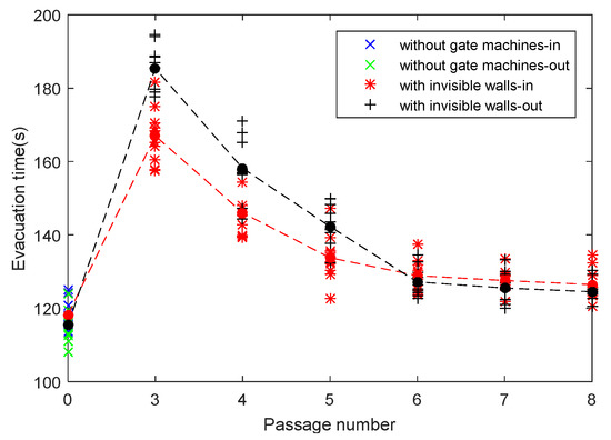 In this section, the effects of passage numbers on the evacuation time of a crowd going from the indoor area to outdoor area will be discussed. We compared the evacuation time in three cases, that is, without any gate machines, with gate machines with invisible walls, and with gate machines without invisible walls. At the beginning of the simulations, pedestrians appeared randomly from the far left of the area, and a passage was selected to pass though and move to the right according to the method determined in Section 2.2. We assume that the pedestrians can go through the gate machines directly without pausing. Ten simulations were performed in each case. The results of each time and the average value of each case are shown in Figure 4. Passage number 0 corresponds to the case when there is no gate machines.