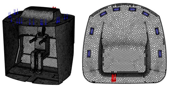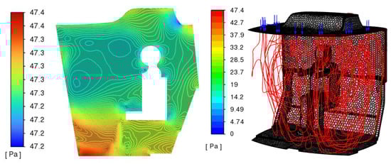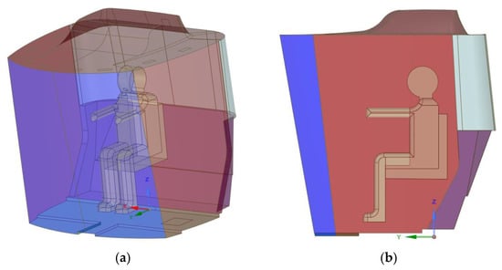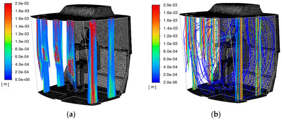For the boundary conditions of the driver’s body surface for velocities, the standard no-slip conditions (equal to zero velocities) were used, as for ordinary walls. To simulate particles when they hit the human body, the “trap” boundary condition was used, i.e., particles were removed from the calculation.