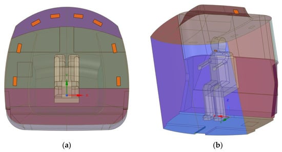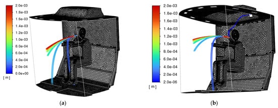 Figure 2 shows a diagram of a typical tractor cab. Air enters the cabin through deflectors on the roof at a given speed, temperature, and humidity, and characteristics for pathogen particles (Figure 3a). The outlet at the top rear of the cabin is set to zero relative pressure (Figure 3b). Additionally, the oral cavity of the driver can be taken into account as sources of viruses (Figure 3b).