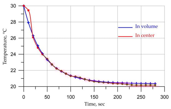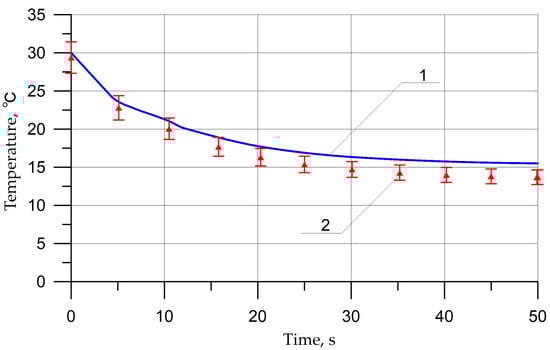 The numerical results in the fields of velocities, pressures, and densities of this study were compared with the results of [], where a study was also carried out using RANS equations without moisture and particles but taking into account the total external air domain. Figure 17 shows the temperature values in the central part of the cabin from time to time for these incoming flows specified in []. As can be seen from the graph, the temperature differs slightly, and the differences are probably due to the humidity in the current model.
