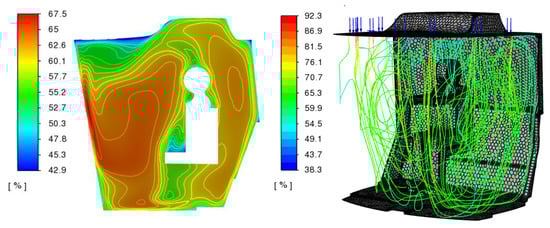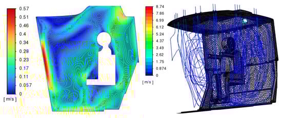 - In this work, only one value of air humidity was considered: “non-evaporable” particles. It is also quite interesting to study the influence of the humidity value on the evaporation of particles, and therefore on their behavior in the volume of the cabin. In addition, the question of the influence of the airflow directions of the air deflectors of the climate system and the internal equipment of the cabin remains unexplored. These studies, field tests and comparison of the results are planned to be carried out in subsequent works.