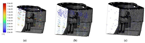 - “Large” drops, with a diameter greater than approximately 400 microns, hit the wall and were removed from the calculation in accordance with the sticking condition on the walls of the cabin.