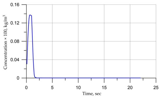 - “Small” droplets, with a diameter of more than 400 μm, in the case of non-evaporability of droplets, propagate through the cabin along the streamline of air velocities, and the dependences of concentrations and the number of particles in the cabin on time are plotted.