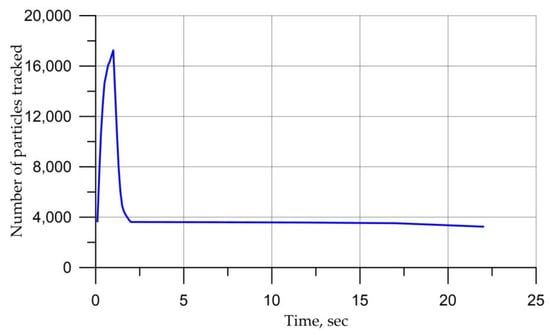 To solve the equations considering particles, it is necessary to unambiguously know the initial particle diameters of respiratory bioaerosols, the velocities, and the number of particles. At the same time, the range of particle sizes can differ significantly depending on external conditions, and the study of this issue is the topic of separate studies. In this paper, the particle size is in the range of 2 to 2000 microns according to the Rosin–Rammler distribution [] (Table 3, Figure 5).