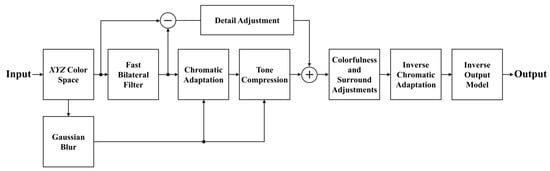 The iCAM06 uses a two-scale decomposition method to reduce halo artifacts that occur during tone compression and preserve image detail. The two-scale decomposition is a method of applying contrast compression only to the BL after separating the input image into BL and DL. The iCAM06 uses a fast bilateral filter to obtain the BL. The bilateral filter can smooth the brightness change of an image while preserving the edges, and is used for noise removal and contrast reduction. The fast bilateral filter is a method that applies subsampling and piecewise-linear bilateral filtering in the frequency domain to improve the processing speed of the bilateral filter [15]. In the iCAM06, the BL is used for chromatic adaptation and tone compression, and the DL is used for detail adjustment. The two layers are merged into a single image, and color and surrounding adjustments are applied to the combined image. Finally, an inverse transformation model is applied to the rendered image to be displayed on an output device. Figure 1 shows the flowchart of the iCAM06.