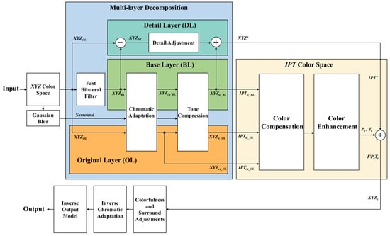 - The multi-layer decomposition is used to divide the image into base, detail, and original layers. The base layer is used for the chromatic adaptation and tone compression. The detail layer is used to enhance the detail information. The original layer is used to obtain the color distortion region and the necessary information for the color compensation and enhancement.