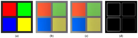 Figure 3 shows the tone compression result of the test image. Figure 3a is the input image. Unlike this pattern image, a general image has detailed information. Therefore, tone compression is applied only to the separated base image for preserving the detail information. The test image in Figure 3 shows the problem of reproduction of the boundary of tone processing for the separated base image. Figure 3b,c show the tone-compressed BL and OL images, respectively. A halo effect due to color distortion appears around the four square patterns in Figure 3b. In particular, the red halo effect is displayed at the border of the blue rectangle. On the other hand, in the image of Figure 3c, the halo effect does not appear around the square pattern. Figure 3d is the color difference map and shows the area where the color distortion appears in Figure 3b. The color distortion occurs around the edge of the rectangle. The larger the color distortion, the larger the color difference value and the brighter the pixel value in the corresponding area. The color difference map ranges from 0 to 1. The large color distortion areas have values close to 1. The equations of the color difference map are as follows: