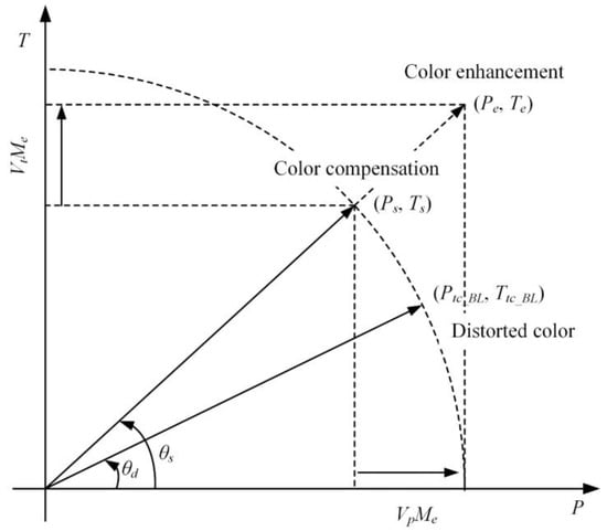 Figure 5 shows the proposed color compensation and color enhancement. Distorted colors (Ptc_BL, Ttc_BL) are transformed into standard colors (Ps, Ts) using the proposed color compensation. The hue of the distorted color shifts from θd to θs. In the IPT color space, the angle on the PT-axis represents the hue. The saturation of the color boundary area is improved by using a color difference vector for the standard color. The enhancement stop mask is used to adjust the size of the color difference vector to prevent white point shift or hue shift in the low-saturation boundary area.