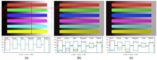 We used test patterns to compare the performance of the proposed method and iCAM06. The test pattern in Figure 6 consisted of bars of red, green, blue, magenta, cyan, and yellow. The figure in the first row of Figure 6a–c shows the input image and the resulting images of iCAM06 and the proposed method, respectively. The graphs in the second row show the distribution of RGB pixels in the area indicated by the red arrow in Figure 6a. In the iCAM06 image in Figure 6b, a halo artifact appeared between each color bar and the background, and a purple halo artifact appeared particularly strongly at the blue bar boundary. In the graph of Figure 6b, the distribution of RGB pixels was not uniform in the boundary area of each color bar, and the intensity level changed rapidly. On the other hand, in the image using the proposed method in Figure 6c, the distribution of RGB pixels was uniform, and the halo phenomenon did not appear.
