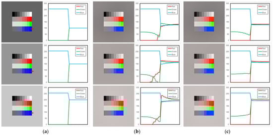 Figure 7 shows the input image, the resulting image for each method, and the pixel distribution graph. The input images consisted of gray, red, green, and blue patterns and three backgrounds. The intensity levels of the gray background were 100, 150, and 200 from the first row. The red arrow in Figure 7a indicates the distribution of RGB pixels for each image. A strong intensity boundary was created between the gray background marked with an arrow and the blue pattern. Figure 7b shows the results of iCAM06. In the first row, the distribution of green increased in the intensity boundary area. As a result, a green halo appeared in the blue pattern area of the iCAM06 image. In the results of the second row, the distribution of red as well as green increased, and in the third row, the distribution of red increased rapidly, so the red halo was conspicuous in the boundary area. Figure 7c shows the results of the proposed method. In the image for the proposed method, the distribution of brightness in the intensity boundary area was more uniform than that in the iCAM06 image, and halos did not appear.