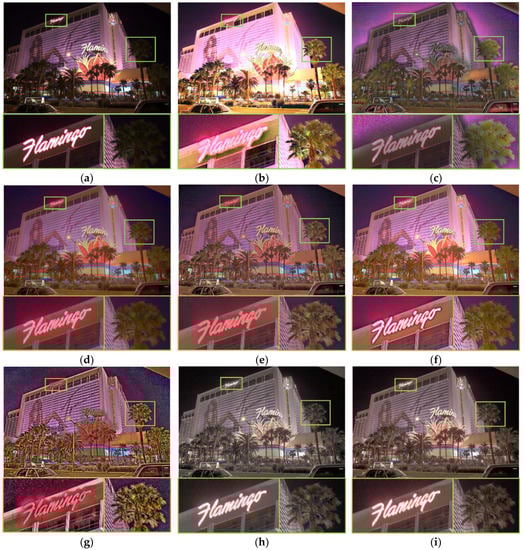 In Figure 10a–g, the conventional methods showed reddish images due to extremely high chroma. In the Banterle result, saturation appeared in the bright areas of the building, and in the Bruce result, the detail in the leaves of the trees disappeared. In the Shibata result, a lot of noise appeared due to an excessive increase in detail. In the iCAM06 result, there was cyan color noise in the “Flamingo” sign and the red color was distorted at the tip of the tree leaf. In the proposed result, the noise of the “Flamingo” sign was removed, and the color distortion in the tree leaf area was improved.