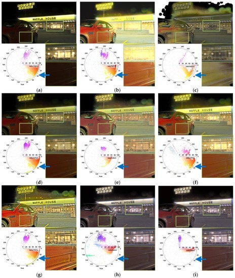 In Figure 11, the Banterle result showed saturation in the signage and indoor areas of the building. The Bruce result had brightness and color distortion appearing throughout the image. The Reinhard, Liang, and Li results had low contrast, and the Shibata result had a halo effect in indoor images. The polar chart at the bottom left shows the distribution of hue and saturation for the car door area. The angle in the polar chart represents the hue, and the distance away from the center of the chart represents the saturation. The degree of saturation is achromatic at the center of the chart and pure color at the edges. In the input image, the color distribution of the car door was composed of purple and red. In the iCAM06 result, the proportions of purple and blue were further increased, and blue color noise appeared in the cropped image. However, the proposed method reduced color noise and color distortion.
