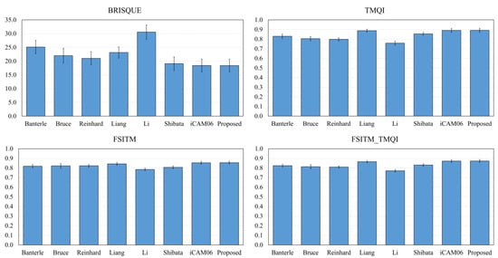 BRISQUE is a model proposed to measure image quality based on a natural scene statistics framework. BRISQUE measures the naturalness and distortion of an image using the statistics of pair-wise products of neighboring luminance values. TMQI and FSITM were developed to objectively evaluate the performance of tone-mapped images generated from TMOs. TMQI consists of the multi-scale structural fidelity measure and statistical naturalness measure. The multiscale structural fidelity measure evaluates structural information between HDR and tone-mapped LDR images. The statistical naturalness measure evaluates the brightness and contrast of a tone-mapped image. The TMQI score is calculated as the weighted sum of the two measures. FSITM is an object index based on the local phase similarity of the original HDR and target tone-mapped LDR images. FSITM uses the locally weighted mean phase angle map that is robust and noise-independent to measure the local similarity. FSITM_TMQI is a combined index of FSITM and TMQI and has been proposed as a more accurate evaluation than the other two existing methods [27]. The BRISQUE score ranges from 0 to 100, and a lower score indicates better perceptual quality. In TMQI, FSITM, and FSITM_TMQI, the score ranges from 0 to 1, and a higher score indicates better image quality. Table 1 and Figure 12 show the scores of the IQA metrics for each method. The number of images used in the test was 50. Each score in the metrics represented the average and 95% confidence interval. The results showed that the image quality of the proposed method was superior to that of other methods. The reason the scores of the proposed method and iCAM06 were similar was that the proposed method was based on iCAM06. It improved the color distortion problem of iCAM06, but the resultant image tones of the two methods will be similar.
