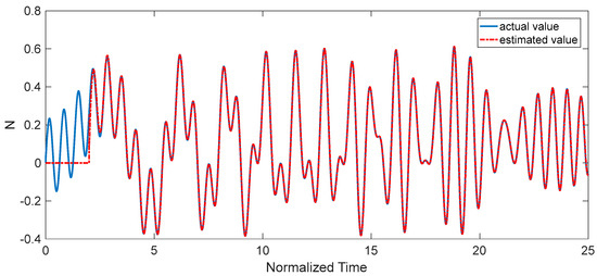 Figure 6, Figure 7, Figure 8 and Figure 9 present the results of stabilizing the nano-beam using the proposed control technique in the presence of disturbances and faults. The controller is turned on at . Figure 6 demonstrates the time history of the deflection of nano-beam based on the proposed control scheme. Based on this figure, after one time unit, the nano-beam is completely stabilized. Figure 7 demonstrates the time history of deflection of the nano-beam using the proposed control scheme. As is shown in these figures, the proposed controller, which is equipped with the fast estimator, could appropriately deal with uncertainties and faults in the actuator which is an important concern in the control nano-systems. Figure 8 illustrates the performance of the controller in stabilizing the system. In addition, the performance of the estimator is depicted in Figure 9. These results conspicuously confirm that by applying the suggested controller, the states of the system reach their desired values in a short period of time.