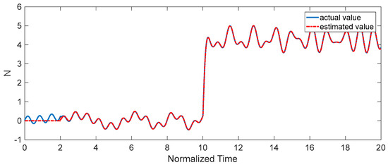 The performance of the proposed control technique has been compared with a PID controller in order to demonstrate its advantages. The control gain of PID is chosen as , , and . In this case, we do not consider faults and failures in the actuators, and only the system is analyzed in the presence of external disturbances. The controller is turned on at Figure 3 and Figure 4 show the results of the stabilization of the nano-beam based on the proposed control technique and the PID controller. As can be seen in these figures, the proposed robust adaptive controller outperforms the PID controller. Additionally, Figure 5 illustrates the excellent performance of the proposed disturbance observer, demonstrating its ability to effectively counteract disturbances and reject them entirely.
