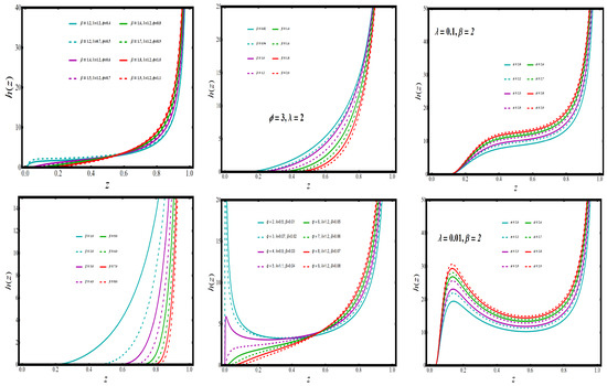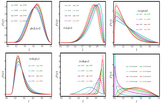 Numerical values for some moments, skewness, variance, and kurtosis of Z for various values of the considered parameters are reported in Table 1. Table 1 reveals that for higher values of , by keeping and fixed, the first four moments about origin, skewness and kurtosis are increased, while the variance exhibits the opposite behavior.