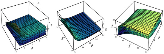 At various levels of and different values of model parameters and , Figure 4 shows maps of skewness, kurtosis and median. The model is discovered to be leptokurtic to platykurtic in nature and positively skewed. As and rise, the skewness becomes approximately equal to 2.3 at the first level of . The skewness is higher at lower and a higher value of Furthermore, the distribution peakedness yields higher values at lower and , but as and increase, it ends up being roughly 1.5. Additionally, the median yields lower values at lower and , but as and rise, it approaches 1.